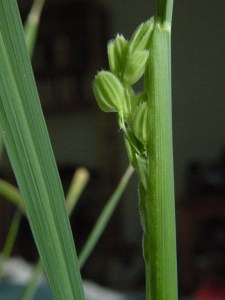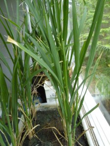 I brought them inside at the end of summer – you can read about them up to that point in my September 5th blog entry. I thought that was that – a “technical success” in that I had plants, but no actual rice. But the plants were just too beautiful to throw out, so I brought them inside, to the south-facing window in my bedroom.
