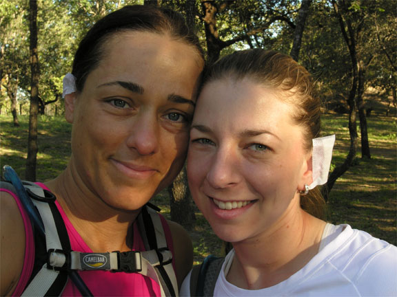 – two CamelBaks (one with water, one with Gatorade) as well as one lightweight rigid plastic water bottle (the three containers were not always full, necessarily, but they gave me options of how to carry my fluids – the rigid bottle is handy because it is faster to refill at aid stations than the Camel bags).