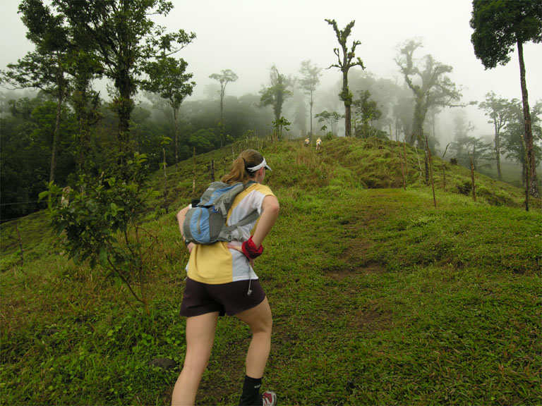 What to carry with you: Well, this of course depends upon the nature of the race you are in, and what to expect in terms of terrain and climate.  You want to travel as light as possible – but, if your route passes through remote areas away from easy access to assistance, you want to make sure you are prepared to take care of yourself.  Some elites may not carry a pack at all, travelling just with hand-bottles and relying on food at aid stations – but you need to be pretty confident about your speed to do that. Things I carried in Costa Rica were: