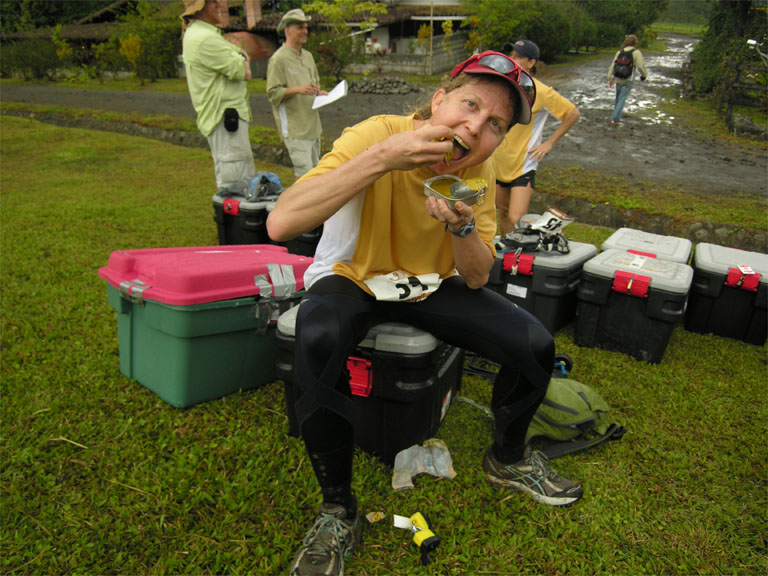 Nutrition in camp: This is one of the most important things to know for multi-day racing.  This is not a piddly little one-day marathon – it’s getting up again and doing another marathon with only 12-18 hours of rest, then getting up the next day and doing it again!  To maximize muscle recovery, it is crucial that you get a big whack of protein into your body within 45 minutes of ceasing activity.  That means that, as soon as you finish for the day, you go straight to your racing box and pull out a tin of sardines or bag of beef jerky and eat it. Do not take off your shoes, do not wash up, do not chat with your fellow racers. Go straight to your box and eat your protein. Then you can deal with the other stuff. (I learned this from Ligia Madrigal – she finished 1st female and 5th overall at the 2009 Coastal Challenge).