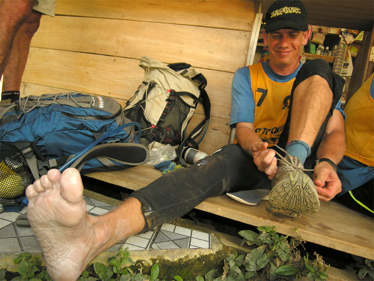 The other thing I do on the trail is put a lot of effort into keeping my feet dry. Anyone racing for a good finishing time won’t bother to do this, but if you are like me, just trying to finish the whole thing, this is something to consider. First, I carried one, and some times two, pairs of spare dry socks in a ziplock bag with me. If you are racing in a hot climate like Costa Rica, you can dry everything in minutes. (This is only worth the effort if you know the trail is going to be dry for the next while, e.g. after a river crossing). Just find a rock in the full sun, and remove your socks, shoes, and insoles, lay them and your feet out in the sun, and within five minutes everything would be bone dry, except perhaps the socks. Even if you don’t take the time to dry everything, just letting the shoes drain for a moment while you squeeze the water out of the insoles, and then putting the dry socks on, gets your feet mostly dry for the next section of trail. I figure if it prevents you from gettting slowed down by blisters later in the race, it is time well spent.