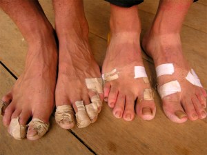 Now tape up the blisters. Make sure you do this at night, because the tape will adhere much better if it stays on all night before you put your shoes back on. Remember that the skin on the blister is no longer attached to the skin below it. If you are going to have to remove the tape again, you will probably peel the whole blister off. So sometimes a band-aid works better than tape, because the middle of the band-aid is not sticky. Or you can put a band-aid on first and then cover it with tape – or find other creative solutions to keeping your blisters’ lids on. While you are at it, tape up any hot spots that threaten to become blisters tomorrow. Remember to use Tincture of Benzoine on any dressings or tape that you plan to leave on for mutiple days.