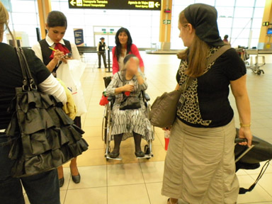 The door guards insist that our bags can not be there – even though we knew that is not true. So eventually Claudia leads our group back to customs. An elderly woman who cannot walk any more is put in a wheelchair. I say goodbye