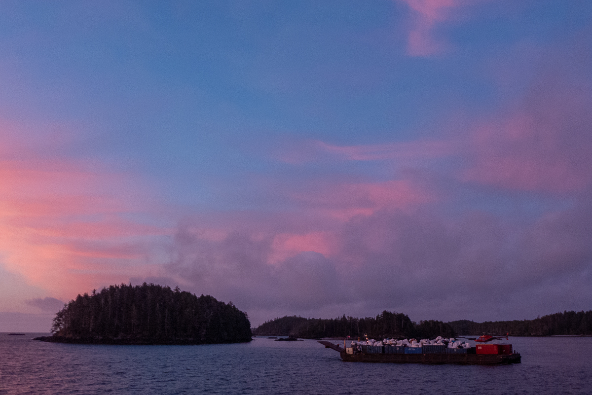 The barge was the Heiltsuk Horizon: operated by the Heiltsuk First Nation, towed by the tug Gulf Rival, all crewed by Lorne the captain (you can see him in the tug’s wheelhouse) and mate Robert (a member of the Heiltsuk First Nation, far left in the photo) as well as the deckhand Rudy, who was present for Expedition 1.