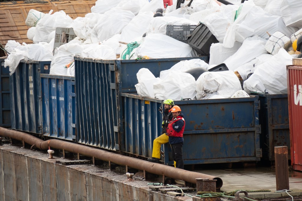 When you look at all of those lift-bags on the barge from a distance, it’s hard to tell what the magnitude of everything really is. They look almost like regular garbage bags. But this photo, of Nolan and Robert in front of the bins, gives a bit of an idea of scale. We ended up loading over 70 TONNES of debris onto the barge in under a week! For a total of 127 tonnes over the two expeditions.